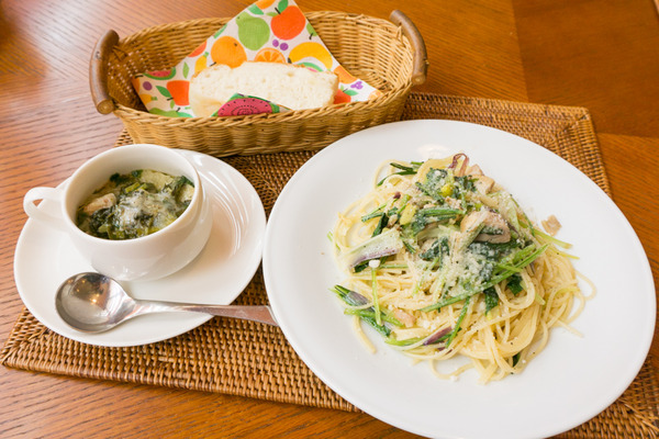 スープは黒キャベツと太ネギと春菊のスープ。パスタにも有機栽培の水菜と太ネギと野菜にもこだわったセット内容。毎朝焼きたてのフォカッチャのもちフワ食感もついてきます。