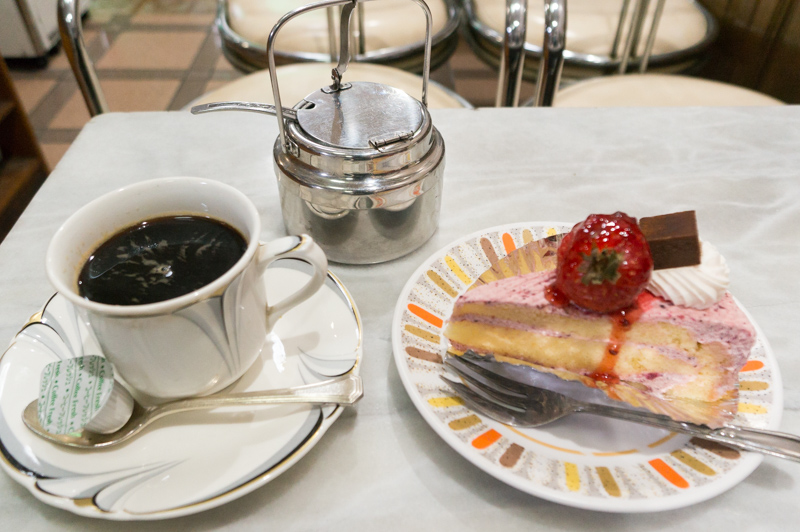 ケーキセットはお好きなケーキとお飲み物で税込500円。いちごのケーキとホットコーヒーを選びました。