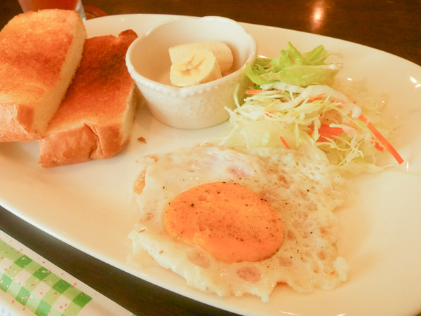 目玉焼きはしっかり黄身まで火を通してあるタイプで味付けは塩コショウ。