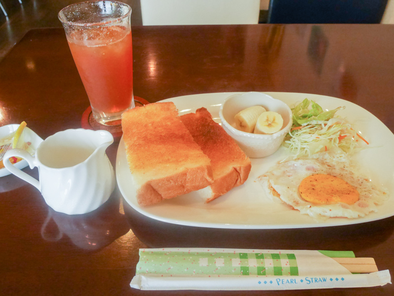 右の白い入れ物がシロップなんですが、うっかり机に置いてあったシュガーを入れてしまってお店の方に「ちょ!それやて!」と朝からツッコミをさせてしまいました。すみません・・・