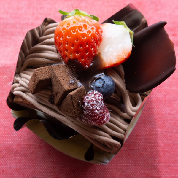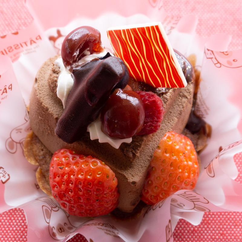 いちごがキュンと甘酸っぱくて、チョコの飾りがパリッとおいしくて、下のチョコスポンジがふんわ〜り濃厚なチョコの風味が広がるー!!