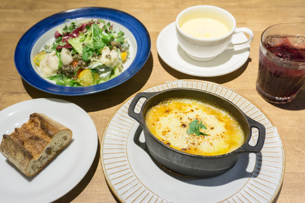 メインディッシュランチには、スープ、具だくさんサラダ、本日のメイン料理、バタール(パン)が付きます。フランスのお料理とワインが楽しめるお店。