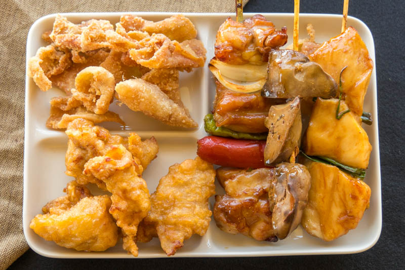 なお、左上が鳥皮のからあげ(300円税別)左下がもも肉の唐揚げ(100g130円税別)右側のエリアが左からバーベQ串焼き(180円税別)肝串焼き(100円税別)ジャンボ串焼き(130円税別)、といったラインナップ。