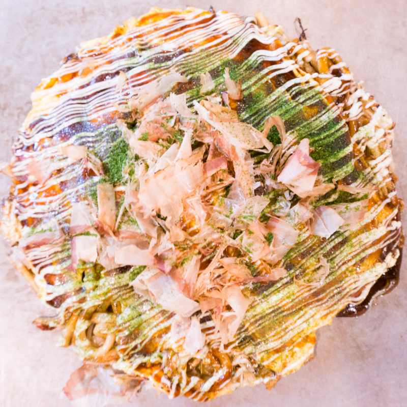 広島焼きに入れる麺がうどんかそばをチョイスでき、+150円でたっぷりネギのせトッピングが可能です。たっぷりの具材でボリューム満点で、食べ応えのある広島焼きでした。