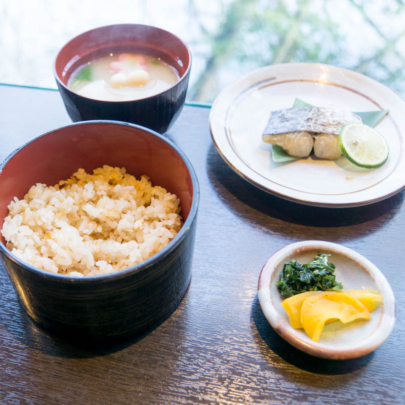 鯛めしと魚(多分サワラ)と白味噌仕立てのお味噌汁とお漬物。