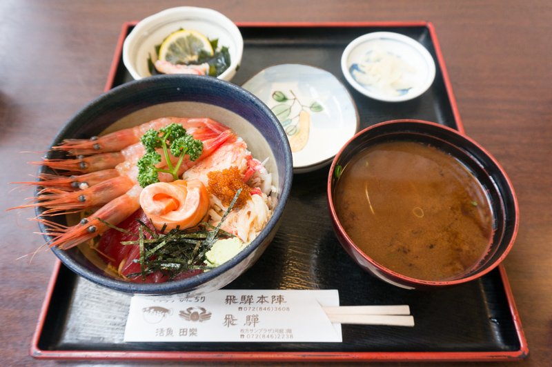 甘エビにまぐろ、サーモンに蟹の身、とびこがたっぷり入った海鮮丼。