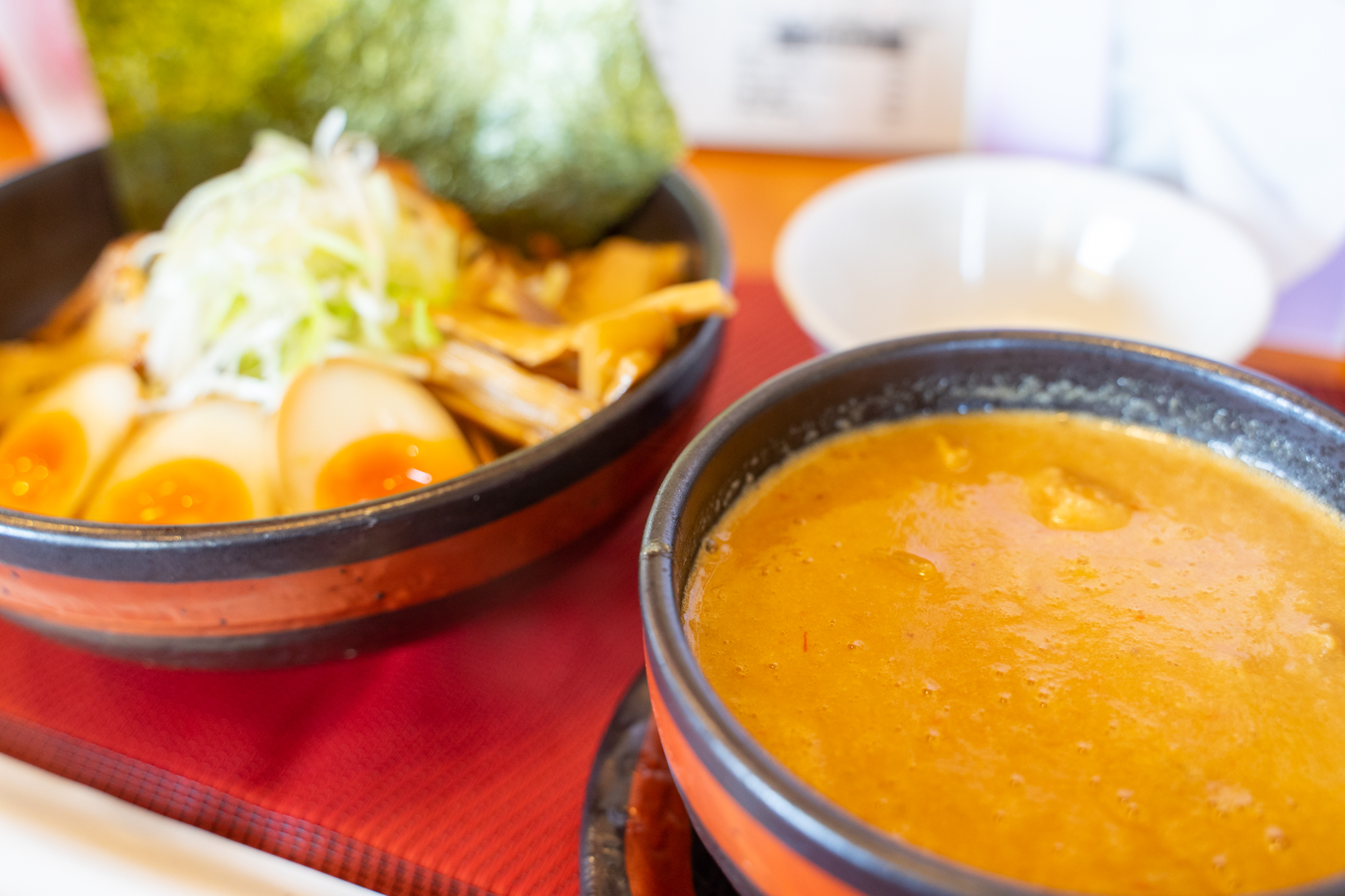 そしてその隣では僕すどん@ひらつーが、担々つけ麺(900円税込)にトッピング全部(計650円税込)をして食べておりました。煮玉子に温泉卵とかもうよくわからない構成。