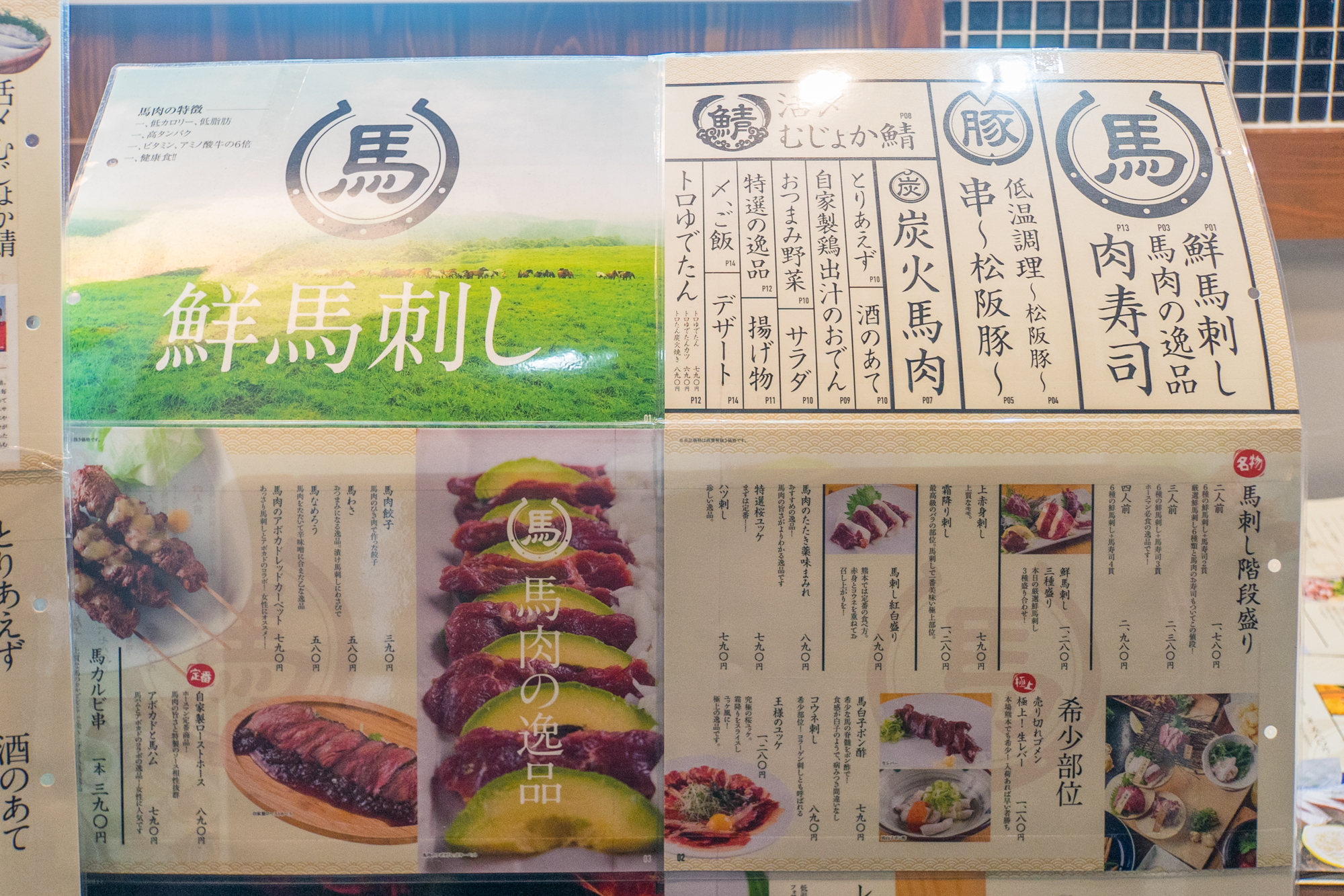 お店の方としては一番のオススメは「馬刺し階段盛り(2人前 1780円税別)」だそうなんですが、注文したら3000円オーバー確実だったので諦めました。誰や3000円のルール!(2度目)