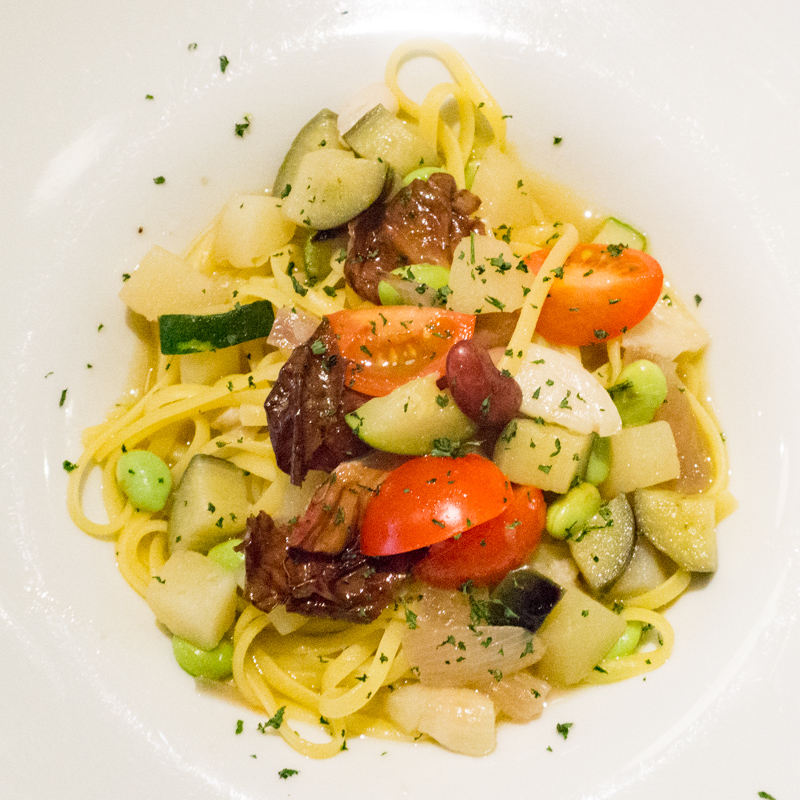 パスタの野菜は、ズッキーニや茄子、枝豆、あずき豆、トマト、玉ねぎなど。