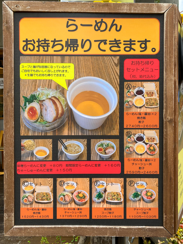 手前が塩らーめん、奥が醤油らーめん(容器代込820円税込)、右が焼き飯です。