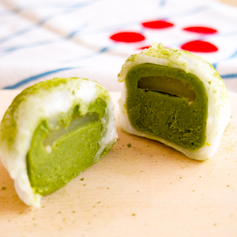 宇治抹茶の苦味や深みの中にパッションフルーツの爽やかなテイストが見え隠れする菓楽オリジナルの大福です。