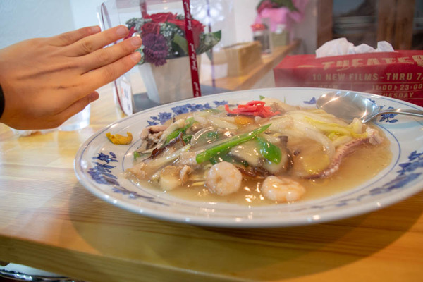 豚肉、エビ、イカ、野菜、様々な具材があんと混ざりあうことで起こる、旨さの融合!
