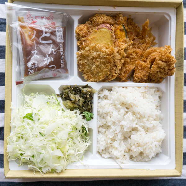 お弁当はごはん、「かつくら漬け、野菜かつ、キャベツ」がセットになったお弁当セットと、キャベツセットから選ぶことが出来ます。