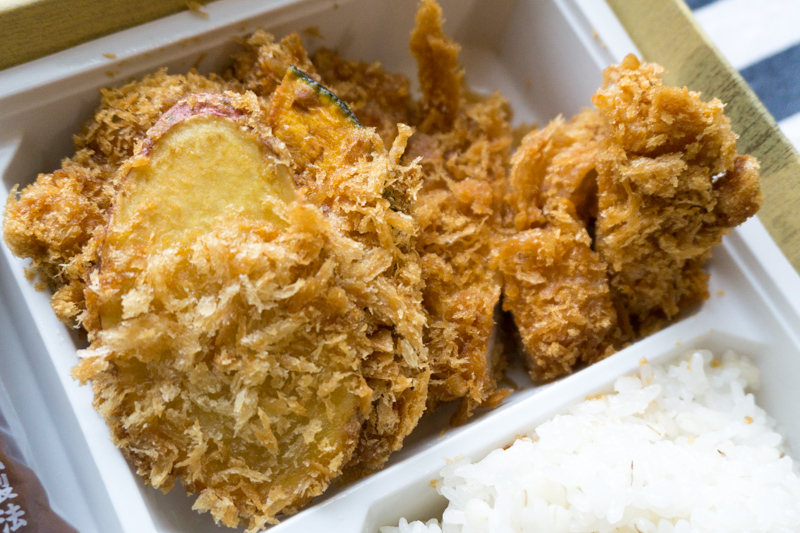 ロースかつの上にあるのは、さつまいもとかぼちゃ。