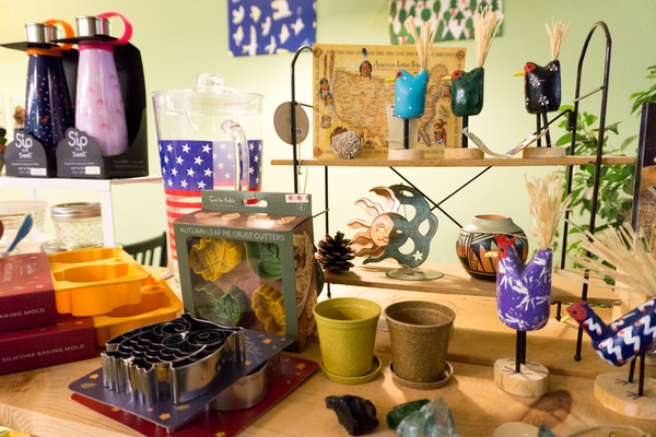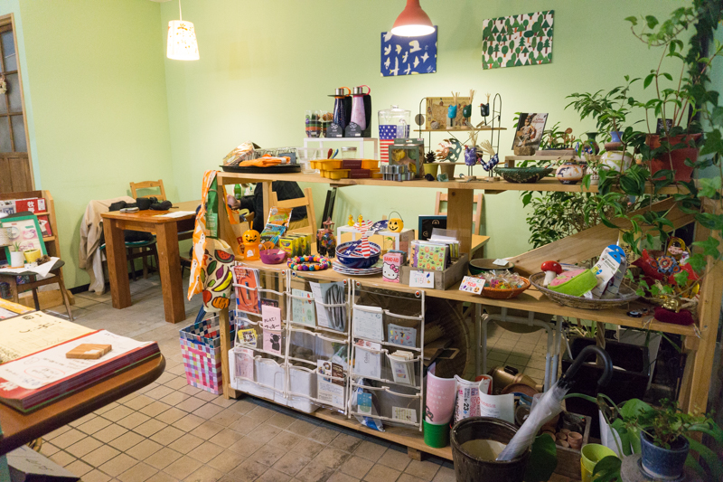 もりもりの雑貨棚の奥にテーブルが2つあります。