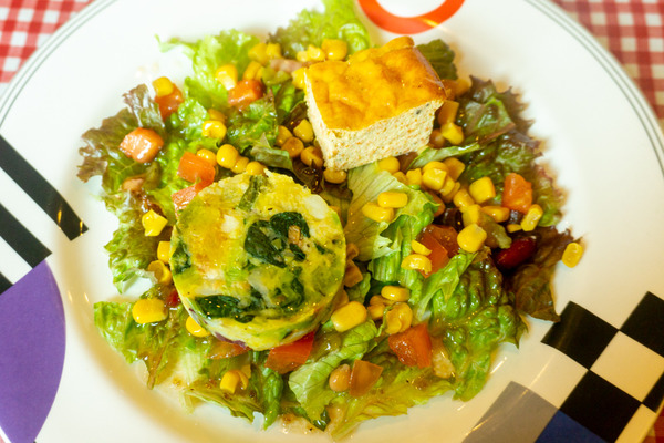 上のケーキっぽいのはフランというオーブンで蒸し焼きにしたオムレツのようなもので、鶏肉と濃紅キャロットが入っています。