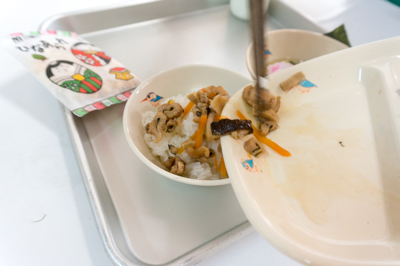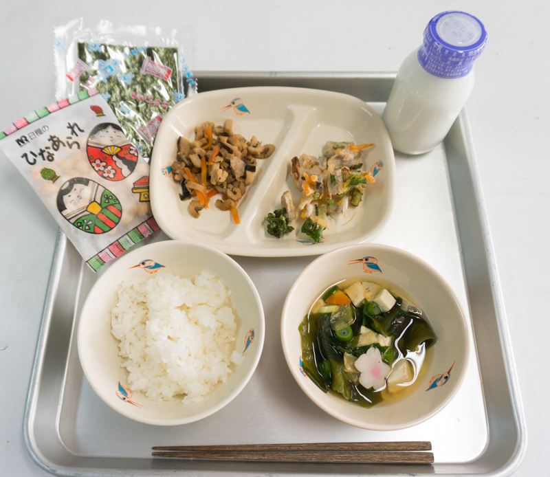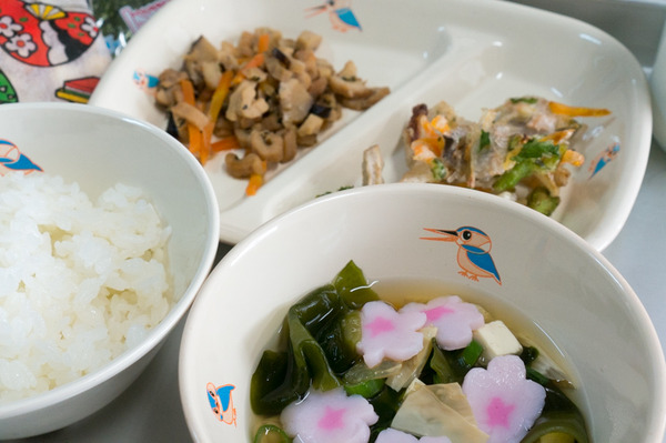 給食の献立はすしご飯、すまし汁、菜の花のかき揚げ、穴子のちらし具、焼き海苔、ひなあられです。