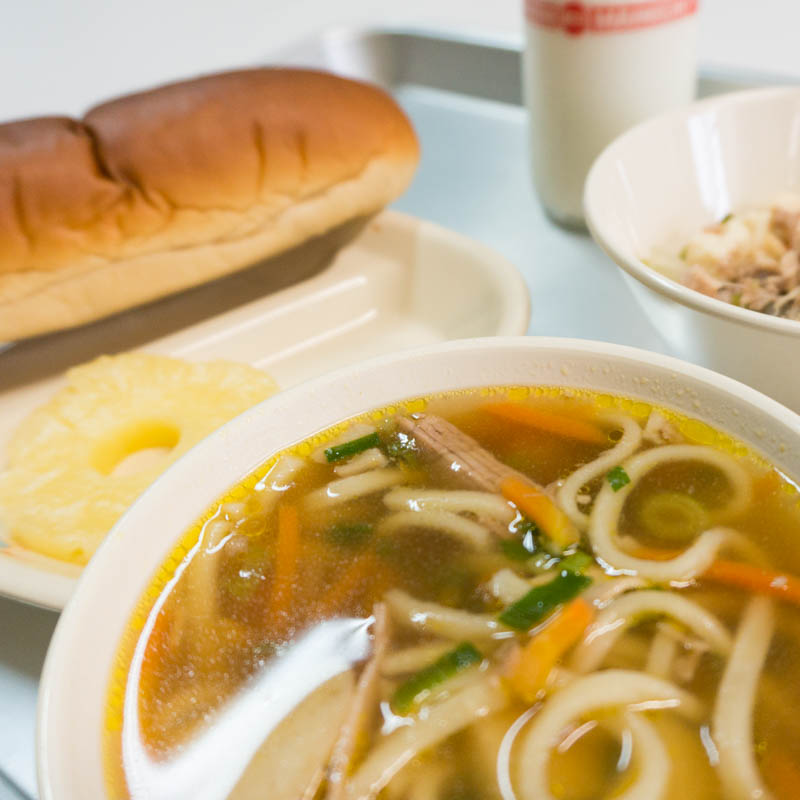 給食の沖縄そばは、麺が少なくどちらかというと汁物に近い仕上がりになります。