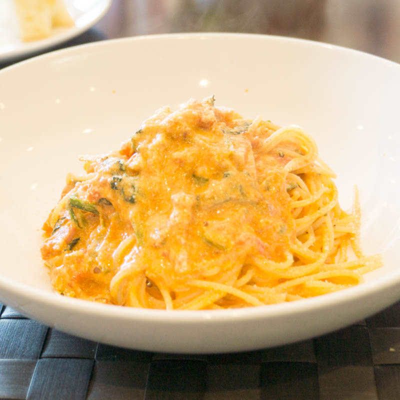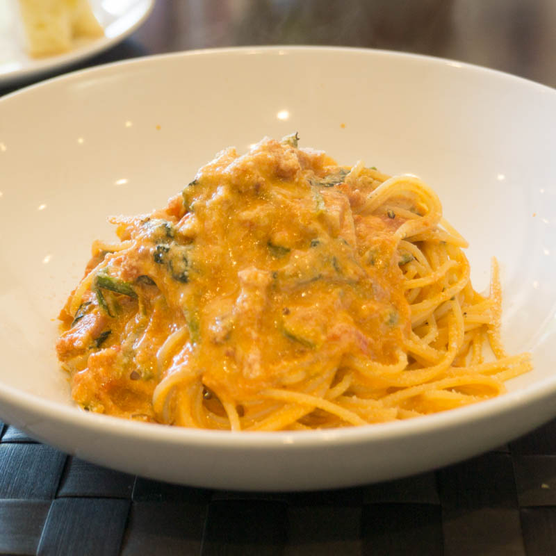 そしてパスタ。やはりイタリアンのお店のパスタはプロの味というか、どうやってもお家では再現できなさそうな、濃厚なトマトクリーム。そしてそのソース絡まるほうれん草。ほどよく口の中でほぐれるパスタ。美味しかったです!