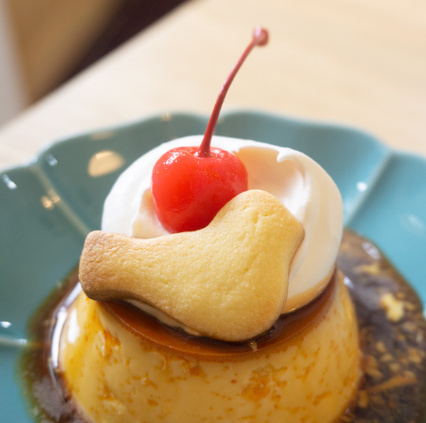 プリンには生クリーム・さくらんぼ・かわいい小鳥のクッキーがのっています。