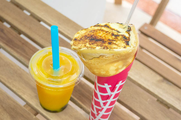 クレープブリュレ(600円税別)とタピオカドリンク(マンゴー味)(380円税別)です。