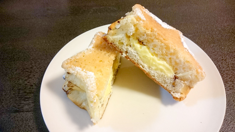 半分にカットするとこんな感じ。クリームは多すぎず、少なすぎずな量 上の部分はメロンパンの皮みたいなクッキー生地になっていて、サクサク食感も楽しめます