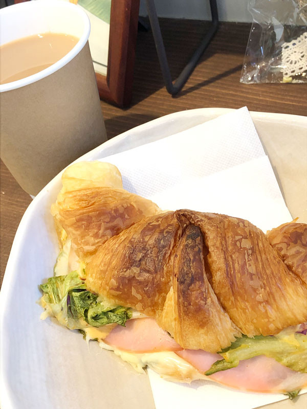 タイ料理のそそる香り調味料がふりかけられていて、ただのおいしいクロワッサンサンドではなくタイ仕様にカスタマイズされた仕上がりに。とても美味しい。