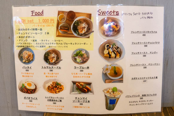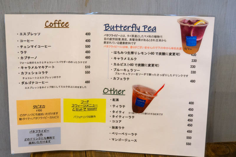 それ以外にはチェンマイソーセージ、本日のデザート、ドリンク(複数から選べます)が付いてきます