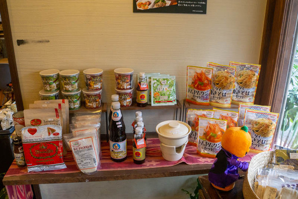 店内にはタイの食材なども。またエスニックな服も色々と置かれています。