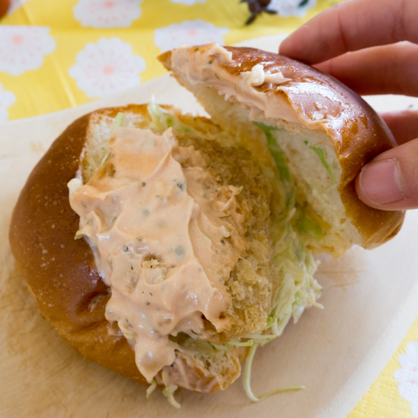 「抹茶と桜のおはぎ」「ぷりぷりえびかつバーガー」です。