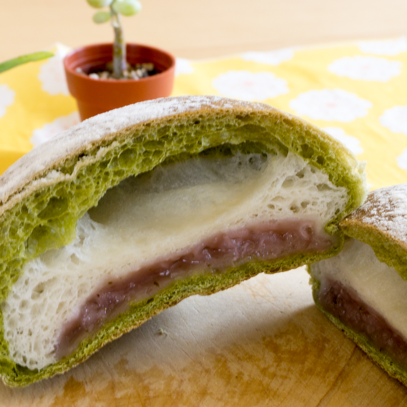 ふわっと香る抹茶の生地に、桜道明寺あんのコラボ。春を満喫できるパン。