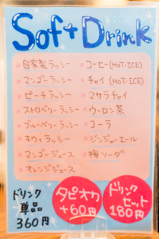インド料理っぽいモノはないかなぁとメニューを見ていたら、ドリンクには自家製ラッシーやチャイなどがあり、ラッシーはマンゴーやストロベリーなど色んな種類がありました。