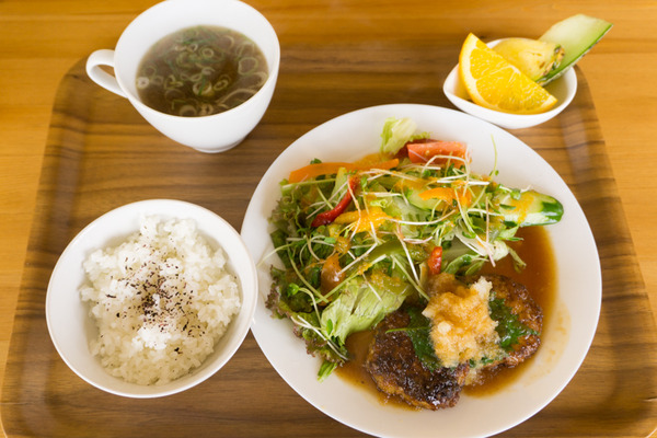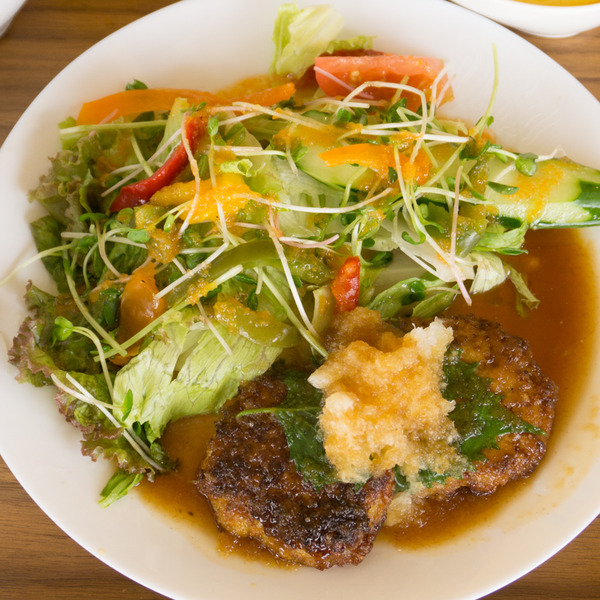 メインの2つのハンバーグはパラディッソの自家製で、食べてみるとふわふわ〜っと柔らかで、口の中が幸せいっぱいに。上にたっぷりの大根おろしと大葉がのっていて、さっぱり系です。濃いものを敬遠してしまう夏にぴったりのハンバーグだと思いました。たっぷりの野菜とハンバーグを一緒に食べるのもまたいい!