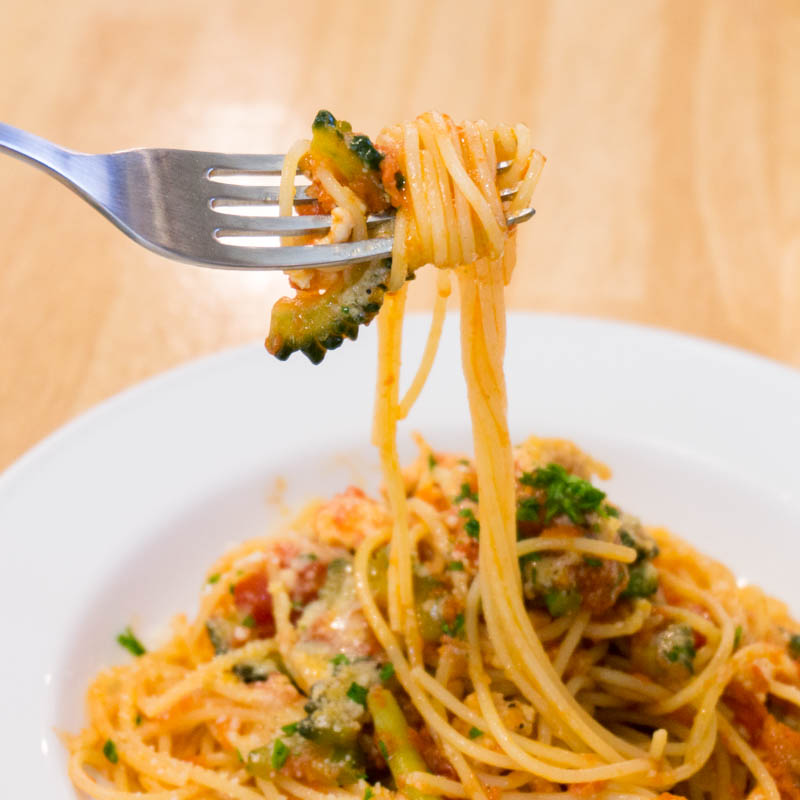 ゴーヤの入ったパスタを食べるのは初めてだったのですが、苦みがほとんどなく、歯ごたえのある食感がソースととても良くマッチしていました。