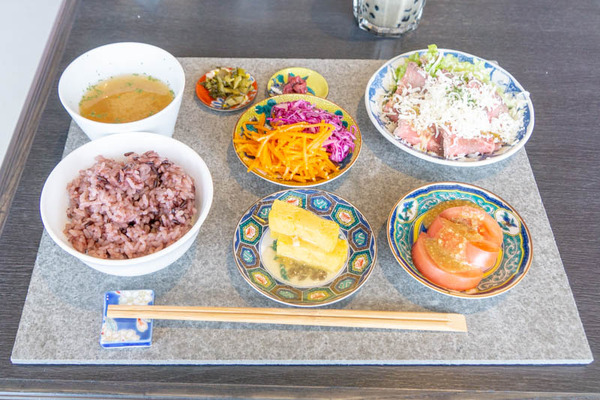 黒米、味噌汁、野菜、メイン料理といったラインナップ。