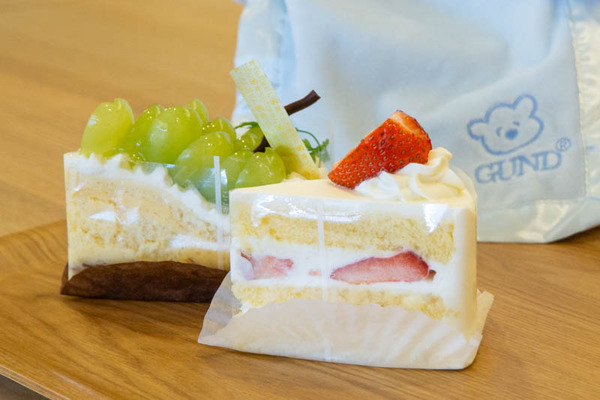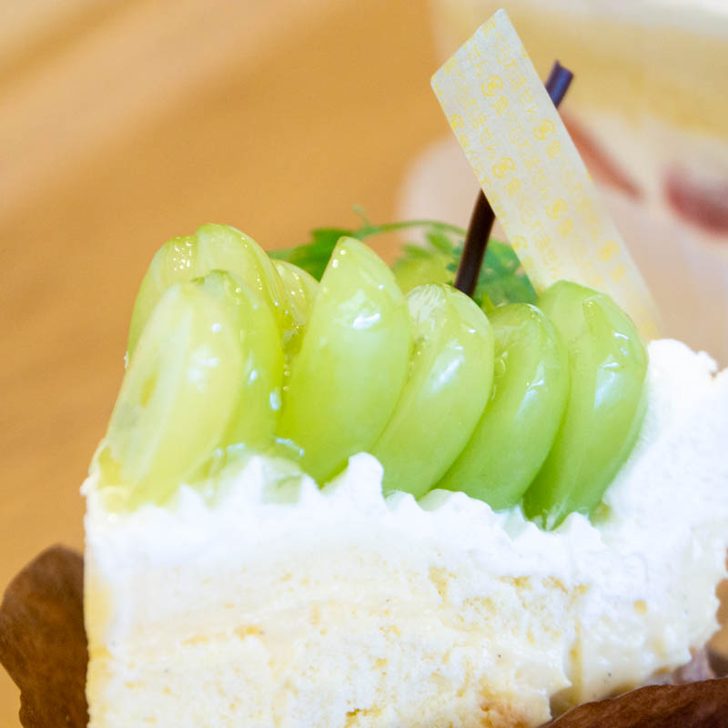 手前から苺のショートケーキ380円、旬のフルーツタルト(シャインマスカット)600円。