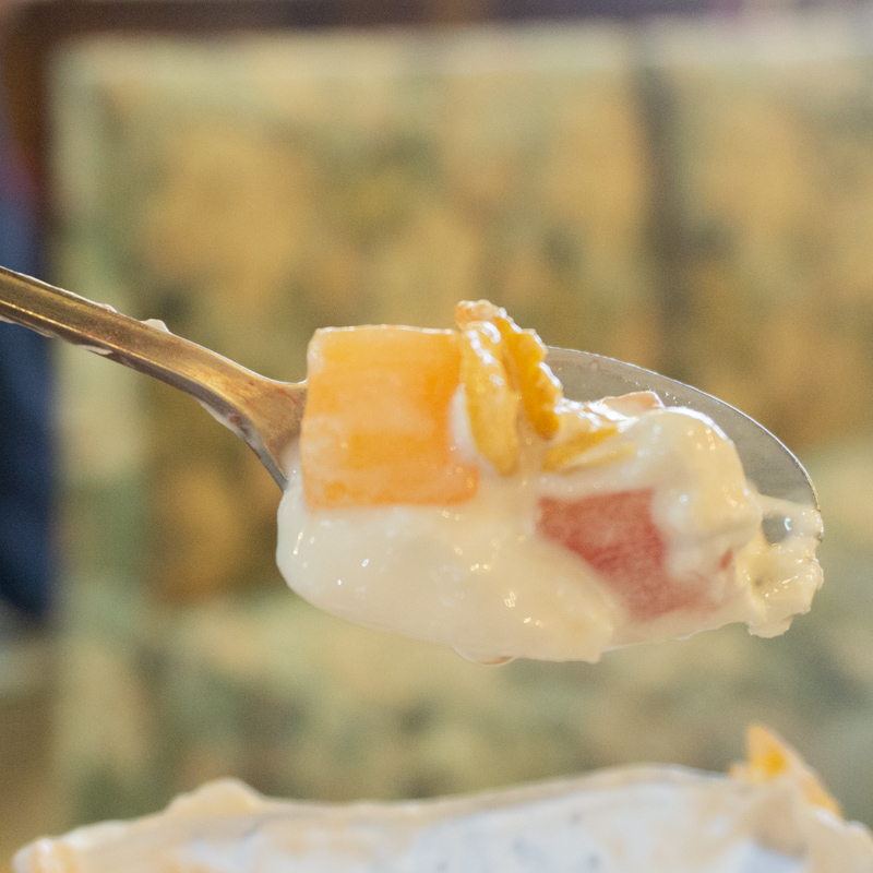 食べ進めていくと、中にはフルーツのゼリーのようなものとコーンフレークがたくさん入っていました。