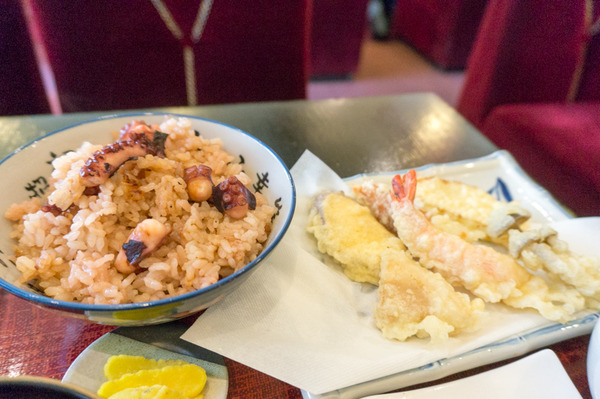 「明石産たこめし」と「てんぷら盛り合わせ」と店頭の看板にあったので、迷わず日替わり定食を注文しました。