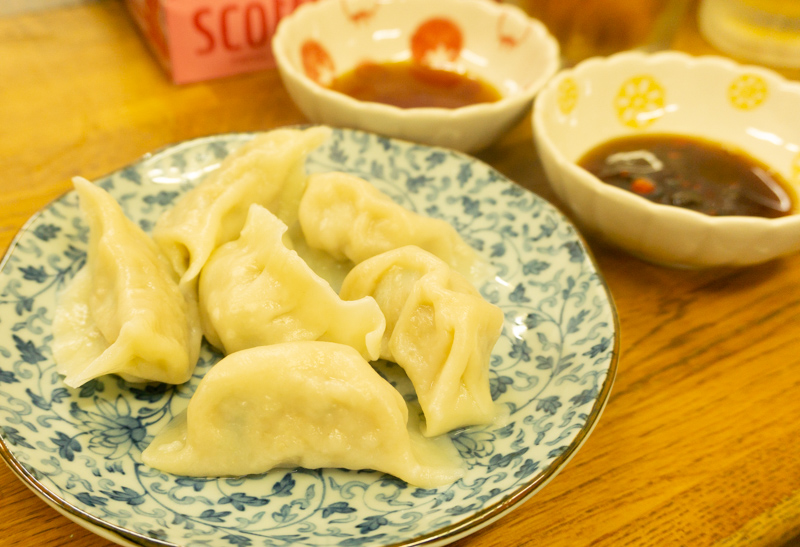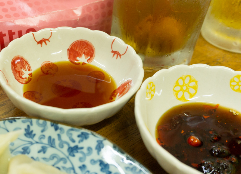 ぎょうざはポン酢でいただきます。左がポン酢で右がさっきのラー油入りポン酢