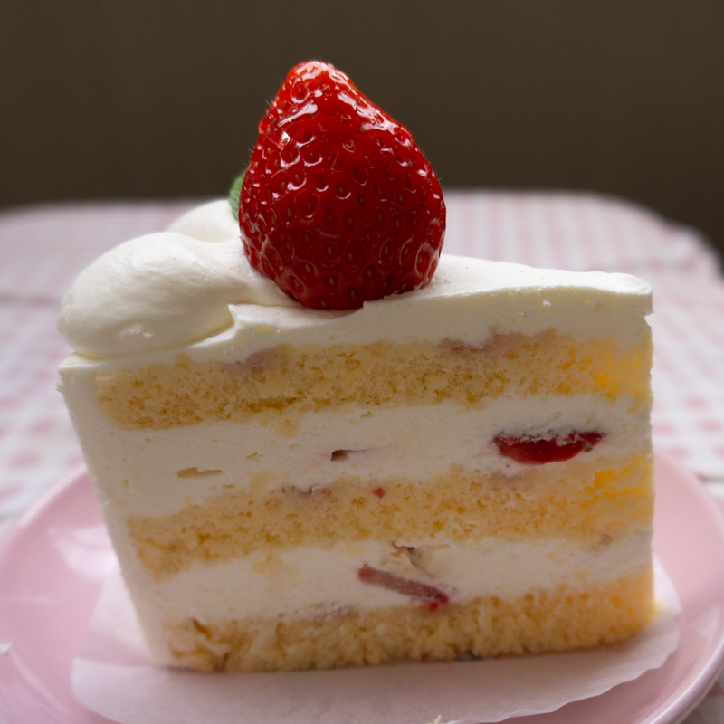 しっとりなスポンジとクリームは、口に入れると幸せが広がります。甘いものがあまり得意でない人でもぺろりと食べられそう。いつも「上のいちごはいつ食べようか?」と悩みます。