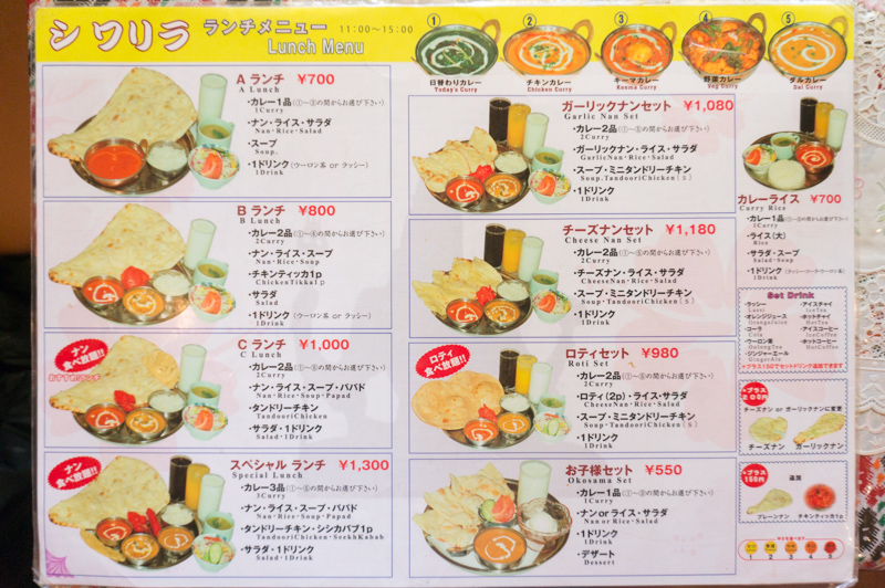 ランチメニュー。カレーは右上に記載されている5種類(日替わり・