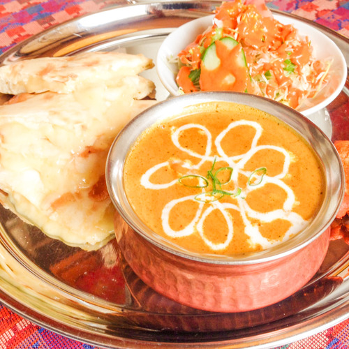 日替わりセットのナンはお腹いっぱいになります。カレーは辛さを5段階で選べます。ランチタイムはナンとご飯のおかわりも自由!