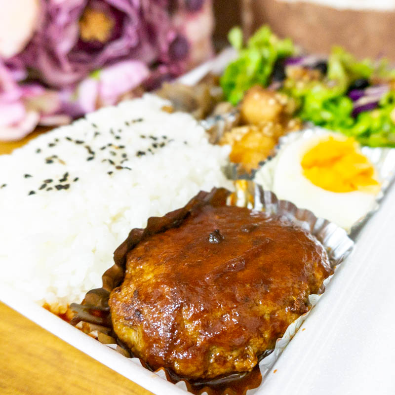 メインは「国産肉の柔らかハンバーグ」or「国産鷄の黒酢甘酢漬け」が選べるそうで、この日はハンバーグをチョイス。