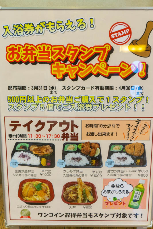 500円以上のお弁当を5個買うことで入浴券がついてくるようです。(3月31日まで)