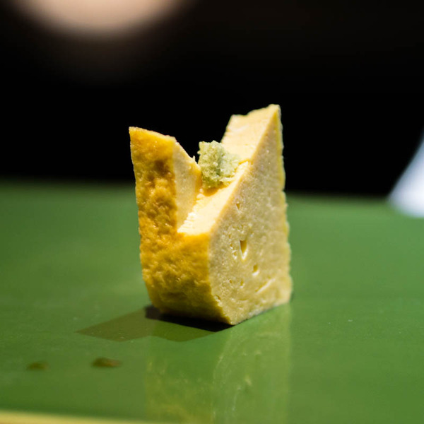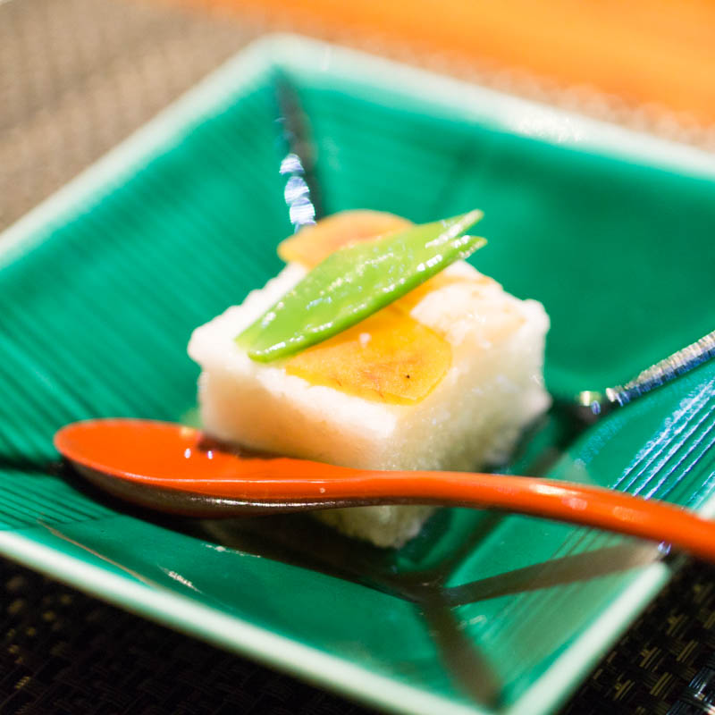 これの正体は……忘れてしまいました。確か下部はゼラチン質な感じでプルップル、上部は魚卵のように粒粒がなめらかなヤツで、上に乗ってる自家製のからすみと一緒に食べると塩加減が中和されてマリアージュでアイニージュー的な。