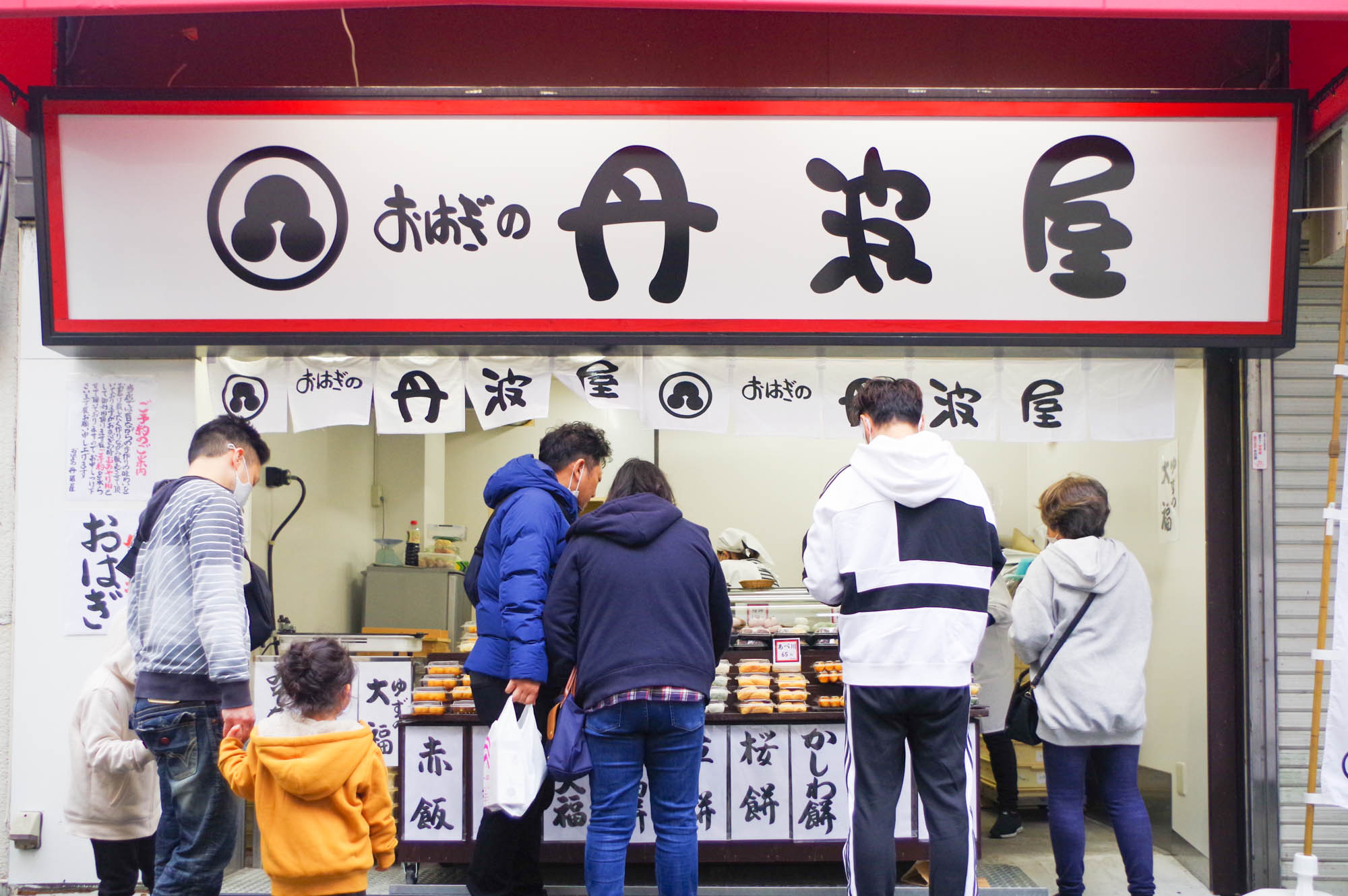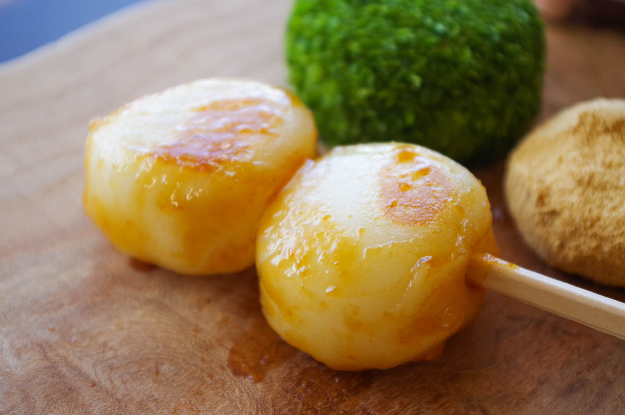 写真左からみそ団子(130円)、おはぎ(青のり)(130円)、あべ川(65円)、天焼(よもぎ)(120円)、赤飯小(390円)です。