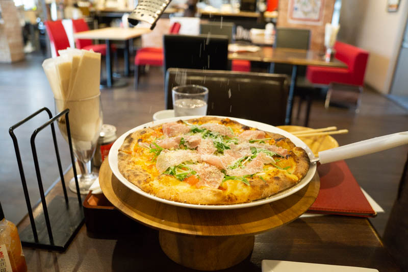 僕が選んだのは「生ハムと水菜のピッツァ」。通常だと「生ハムと水菜のピッツァ」は1500円するのですが、PIZZAランチだと1200円!さらにスープ&サラダが付いてくるので超お得!