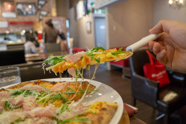 ピッツァは口に入れると速攻で広がる上品なチーズの味、お肉の味、そして水菜が清涼感を与えてくれます。