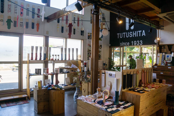 カフェスペースは「つつした」というかかとのない靴下を作っている樋口メリヤス工業株式会社の製造直販店の中。