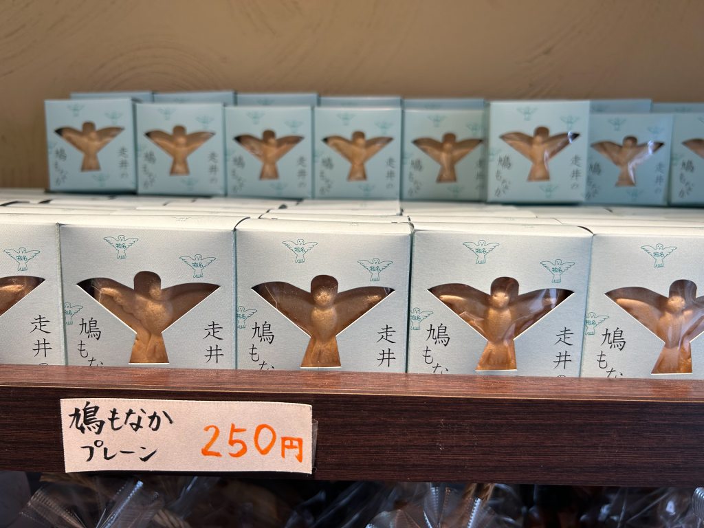 お土産物販コーナーの「鳩もなか」もかわいい。「プレーン」の他「抹茶」もありましたよ!
